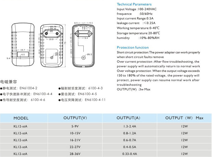頻率:50/60Hz 輸入電流:0.5A 漏電電流:≤0.25A 工作溫度:0-40℃ 貯藏溫度:-20-80℃ 濕度:10%-80%RH 短路保護(hù): 電源適配器在短路解除時(shí)能正常工作恢復(fù) 過流保護(hù):過流故障排除后,電源將自動(dòng)恢復(fù)正常工作 過壓保護(hù):當(dāng)輸出電壓超過額定電壓的150-180%時(shí),電源將保護(hù),故障排除后電源能恢復(fù)正常工作" />