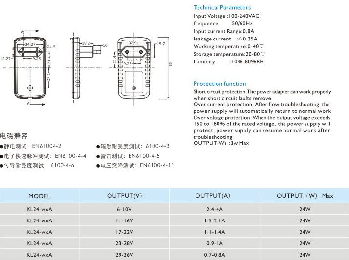 頻率:50/60Hz 輸入電流:0.8A 漏電電流:≤0.25A 工作溫度:0-40℃ 貯藏溫度:-20-80℃ 濕度:10%-80%RH 短路保護(hù): 電源適配器在短路解除時能正常工作恢復(fù) 過流保護(hù):過流故障排除后,電源將自動恢復(fù)正常工作 過壓保護(hù):當(dāng)輸出電壓超過額定電壓的150-180%時,電源將保護(hù),故障排除后電源能恢復(fù)正常工作" />